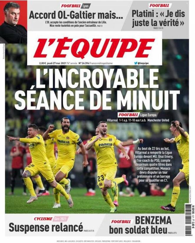 "L'inconfondibile seduta di mezzanotte" titola stamani in prima pagina il quotidiano francese L'Equipe. Dopo 22 tiri in porta, il Villarreal ha vinto l'Europa League davanti al MU. Unai Emery, l'ex allenatore del PSG, ha ora quattro titoli in questa competizione. Il Monaco dovrà giocare un turno preliminare e uno spareggio per qualificarsi in C1. Spazio anche al futuro di Christophe Galtier, allenatore accostato di recente pure al Napoli: "Accordo OL-Galtier ma... ": l'OL accetta le condizioni dell'ex tecnico del Lille. Il Nizza resta comunque in pole per accoglierlo.