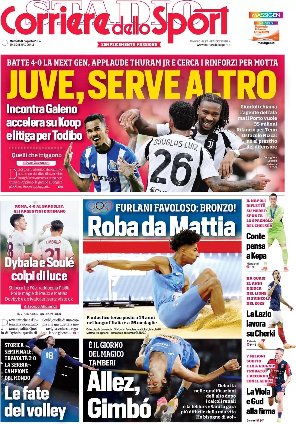 Per cercare di mettere i bastoni tra le ruote all'Inter campione d'Italia "Juve, serve altro", indica Il Corriere dello Sport in prima pagina. Il club bianconero incontra Galeno ma il Porto chiede 35 milioni, rilancio in vista per Teun Koopmeiners dell'Atalanta e Todibo comincia a complicarsi per i diktat imposti dal Nizza.