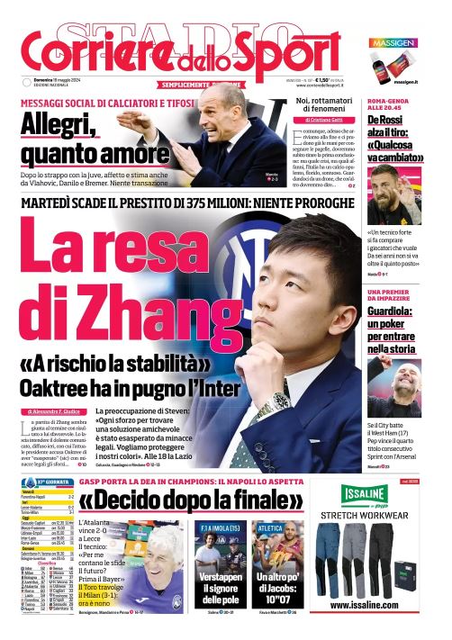 "La resa di Zhang", titola quest'oggi in prima pagina Il Corriere dello Sport parlando della difficile situazione finanziaria del presidente dell'Inter. Il sommario: "Martedì scade il prestito di 375 milioni: niente proroghe". In taglio basso spazio alle parole di Gian Piero Gasperini sul suo futuro: "Decido dopo la finale". Il commento: "Gasp porta la Dea in Champions: il Napoli lo aspetta". In taglio alto un box è riservato all'esonero di Massimiliano Allegri: "Allegri, quanto amore. Messaggi social di calciatori e tifosi". Di seguito la prima pagina integrale