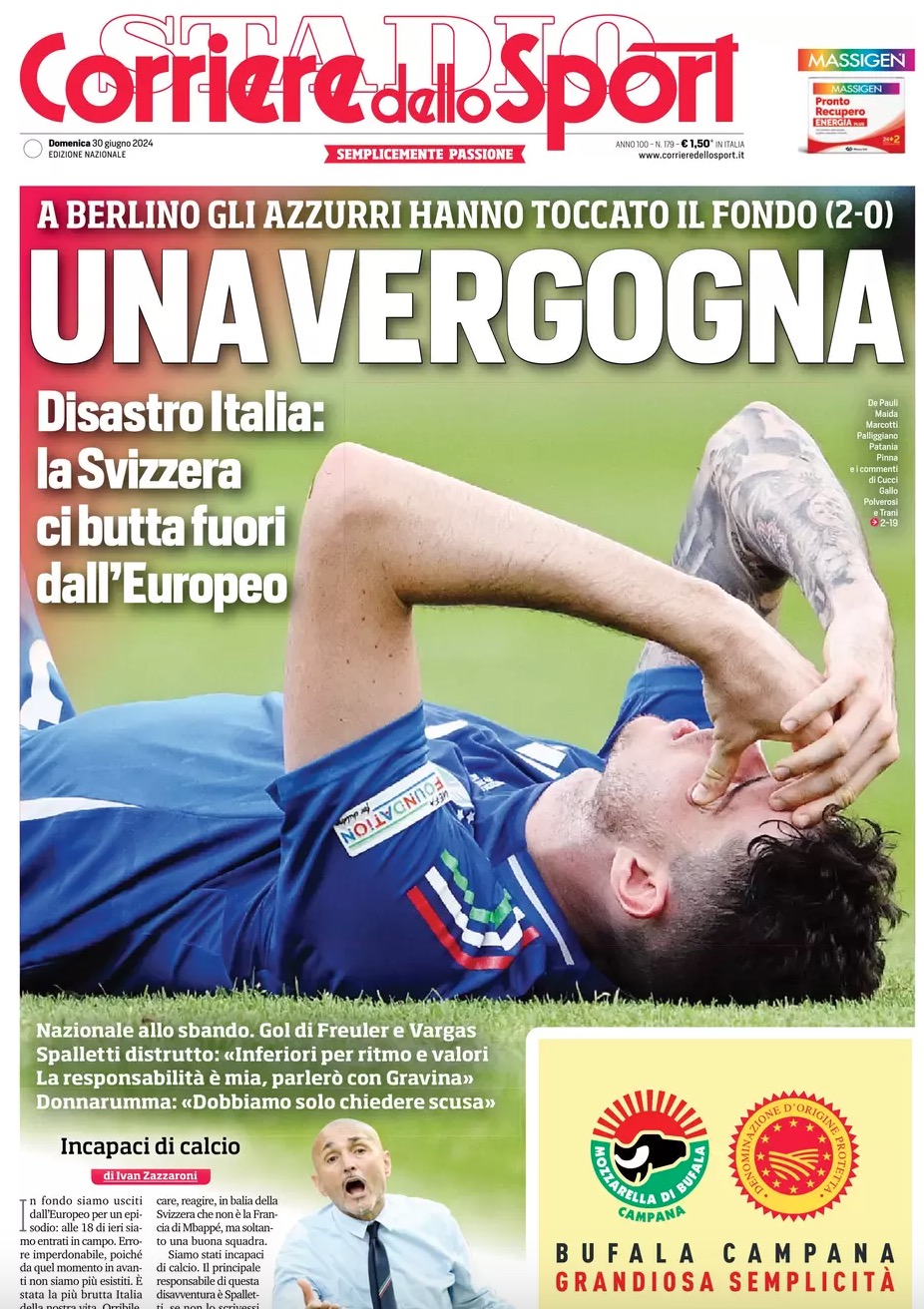 "Una Vergogna", scrive così in prima pagina l'edizione odierna de Il Corriere dello Sport, parlando della clamorosa eliminazione della Nazionale di Luciano Spalletti da Euro 2024. Il sommario: "Disastro Italia: la Svizzera ci butta fuori dall'Europeo. A Berlino gli azzurri hanno toccato il fondo (2-0)". Di seguito la prima pagina integrale