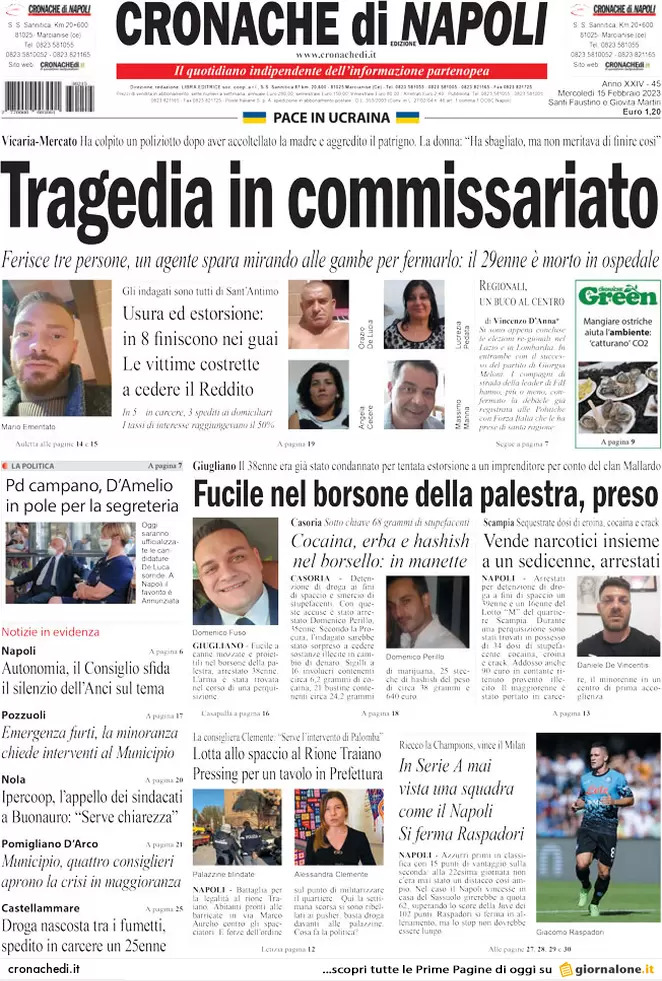 "In Serie A mai vista una squadra come il Napoli", titola stamane in taglio basso Cronache di Napoli. Azzurri primi in classifica con 15 punti di vantaggio sulla seconda alla ventiduesima giornata: non c'era mai stato, nell'era dei tre punti, un distacco così ampio. Ci sono però anche cattive notizie per Spalletti: Raspadori si ferma in allenamento, ma lo stop non dovrebbe essere lungo.