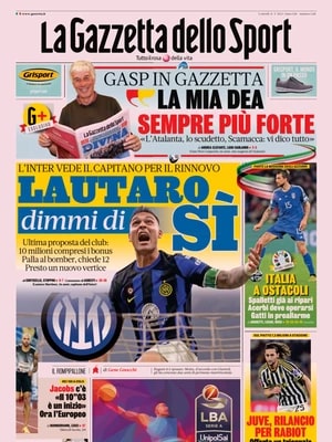 Il titolo principale della prima pagina de La Gazzetta dello Sport è dedicata all'Inter, ieri protagonista dell'incontro con l'agente di Lautaro Martinez per continuare i discorsi sul rinnovo di contratto: "Lautaro, dimmi di sì. L'Inter vede il capitano per il rinnovo", si legge nell'apertura della rosea. Sul taglio alto spicca invece l'anticipazione all'intervista a Gasperini mentre, di spalla, si parla della missione dell'Italia verso Euro 2024 e del rilancio della Juventus per provare a trattenere Rabiot.