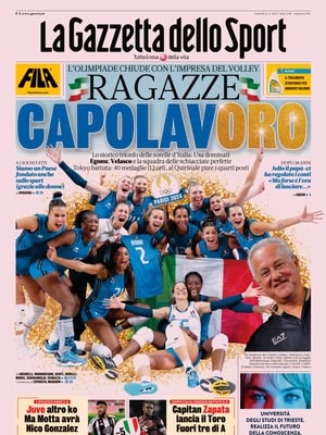 Oltre al titolo principale dedicato all'impresa dell'Italvolley femmine, reduce dall'oro conquistato alle Olimpiadi di Parigi, La Gazzetta dello Sport si concentra anche sul calcio. Nei due box presenti nel taglio basso si parla della Juventus e della Coppa Italia, dove passa il turno il Torino mentre salutano già tre club di Serie A.