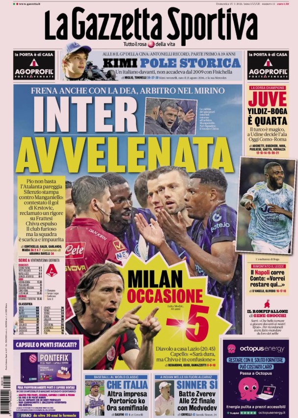 "Inter avvelenata". E' questo il titolo d'apertura dell'edizione odierna de La Gazzetta dello Sport, all'indomani del pareggio dei nerazzurri contro l'Atalanta. Non basta Pio Esposito, la Dea pareggia e il club nerazzurro mette nel mirino l'arbitro Manganiello, contestando il gol di Krstovic e reclamando un rigore su Frattesi. Espulso Chivu.