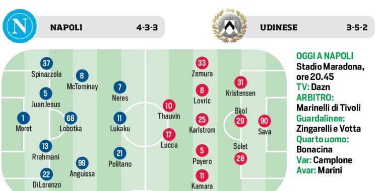 In caso di conferma della formazione, mister Conte dovrebbe schierare gli stessi undici titolari visti nelle recenti sfide contro Juventus e Roma. Meret tra i pali; una difesa con Di Lorenzo, Rrahmani, Juan Jesus e, appunto, Spinazzola o Mazzocchi; in mediana Anguissa, Lobotka e McTominay; e in attacco il trio formato da Politano, Lukaku e Neres.