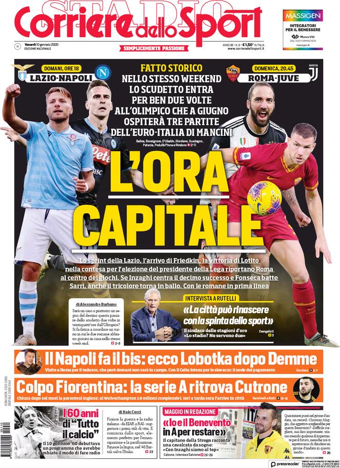Mercato in fermento in casa azzurri. I movimenti di De Laurentiis e Giuntoli trovano spazio anche sulla prima pagina del Corriere dello Sport, che al di sotto dell'apertura dedica uno spazio al mercato partenopeo: "Il Napoli fa il bis: ecco Lobotka dopo Demme". Visite mediche a Roma per il tedesco, mentre per il classe '94 si sarebbe raggiunta l'intesa con il Celta Vigo, ma resta un nodo legato al pagamento. In primo piano il titolo su Lazio-Napoli e Roma-Juventus: "L'ora capitale".
