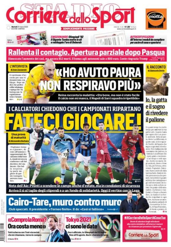L'edizione di oggi de Il Corriere dello Sport apre in prima pagina con l'emergenza Coronavirus ed i calciatori che, come riportato dalla nota AIC, sarebbero pronti a scendere nuovamente in campo passata la quarantena. Spazio, poi, all'intervista all'ex portiere azzurro Pepe Reina che ha raccontato l'esperienza avuta con il Covid-19: "Ho avuto paura, non respiravo più. Sto bene ma non è stato facile. Napoli di Sarri squadra irripetibile".
