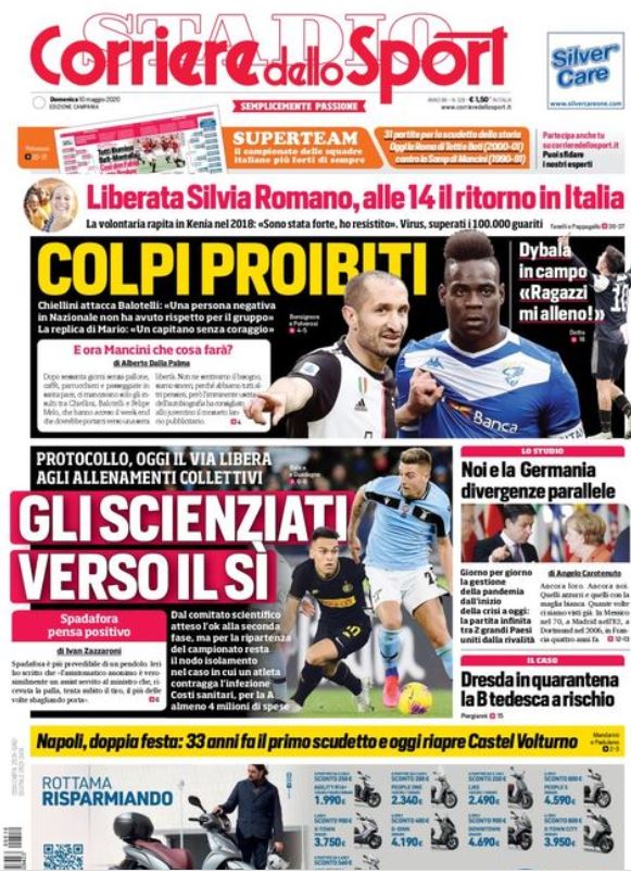 L'edizione di oggi de Il Corriere dello Sport, nella sua versione Campania, apre in prima pagina dando spazio anche al Napoli: 33 anni fa il primo Scudetto della squadra azzurra, ed oggi riapre il centro sportivo di Castelvolturno che accogliere le sedute singole di allenamenti per i giocatori di Rino Gattuso, in attesa di capire se e quando ripartirà il campionato.