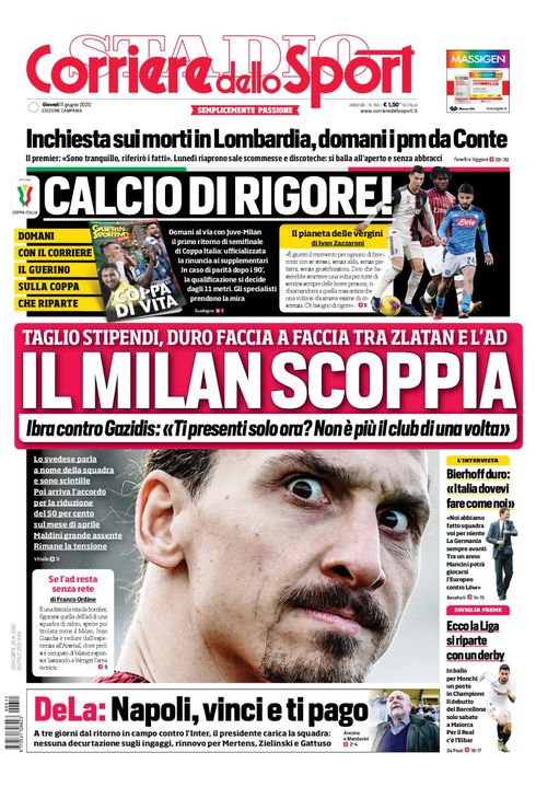 Altre notizie in primo piano: il Milan scoppia dopo il confronto con Ibrahimovic. L'attaccante svedese vuole garanzie sul futuro sapendo che le incertezze sono tante. In basso, per il campionato, ipotesi novantesimo minuto in chiaro dopo le partite. Di spalla la ripartenza della Liga e Bierhoff, ex bomber di Milan e Udinese, che dà un consiglio all'Italia e alla Serie A.