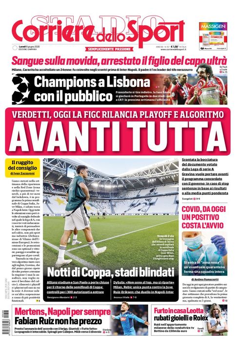 La prima pagina de il Corriere dello Sport edizione Campania apre con il mercato e le parole del direttore sportivo del Napoli Cristiano Giuntoli: "Mertens, Napoli per sempre. Fabian non ha prezzo". Presto l'annuncio dell'accordo con il belga. Giuntoli: "Tutto fatto". Lo spagnolo è intoccabile. Spiragli per Callejon, Milik verso il divorzio