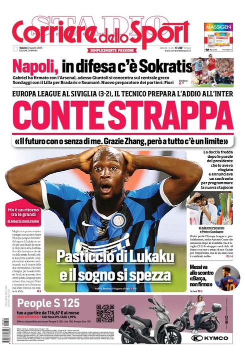 Apertura al mercato del Napoli in prima pagina sull'edizione Campania de Il Corriere dello Sport: "Napoli in difesa c'è Sokratis. Gabriel ha firmato con l'Arsenal, adesso Giuntoli si concentra sul centrale greco. Sondaggi con il Lilla per Bradaric e Soumaré. Nuovo preparatore dei portieri: Fiori". Spazio a centro pagina alla sconfitta dell'Inter in finale di Europa League e alle dichiarazioni di Conte nel dopo gara: "Il futuro con o senza di me. Grazie Zhang però a tutto c'è un limite".