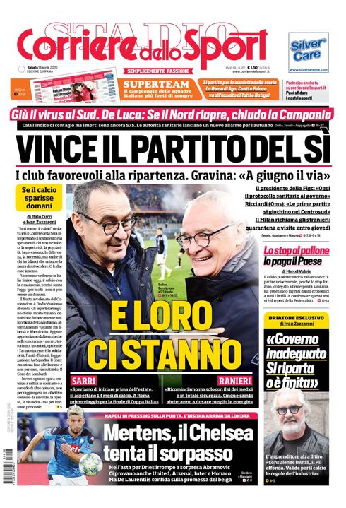 "Mertens, il Chelsea tenta il sorpasso" si legge in prima pagina sull'edizione campana di oggi del Corriere dello Sport. Attorno al belga si è scatenata una vera e propria asta, oltre ai Blues ci sono Inter, Monaco, Arsenal e Manchester United. Il quotidiano però sottolinea che De Laurentiis è tranquillo perché confida sulla promessa del belga strappata il 1 marzo scorso a pranzo sul lungomare. In primo piano il futuro del calcio italiano, Gravina annuncia il via a giugno e i club sono favorevoli alla ripartenza. In alto le parole di De Luca sui possibili provvedimenti per la Campania.