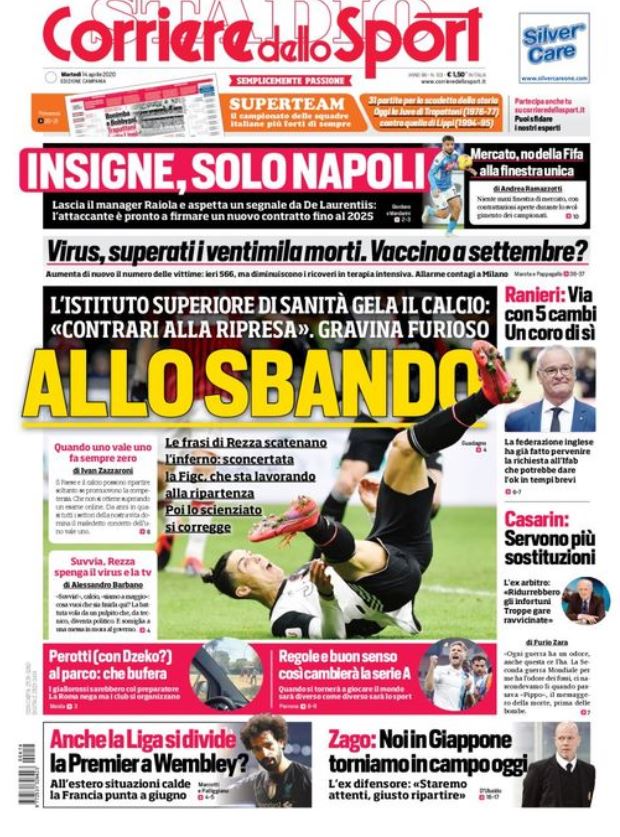 L'edizione di oggi de Il Corriere dello Sport, nella sua edizione Campania, apre in prima pagina dando spazio a Lorenzo Insigne ed il futuro del capitano azzurro: delle scorse ore la notizia della rottura con l'agente Mino Raiola, e dunque ora Insigne aspetta un segnale da Aurelio De Laurentiis per scrivere il proprio futuro. Pronto a firmare un nuovo contratto fino al 2025.