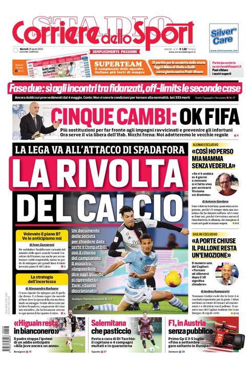 "Così ho perso mamma senza vederla" si legge in prima pagina sull'edizione odierna del Corriere dello Sport, Campania. L'ex brasiliano del Napoli racconta la scomparsa di sua madre e lo fa col cuore in mano. In primo piano la Lega Serie A sembra pronta ad una vera e propria rivolta contro il Governo, con un acceso scambio di opinioni avvenuto nelle ultime ore. Spazio poi alla regole della Fifa, con i cinque cambi che dovrebbero diventare realtà nelle prossime settimane.