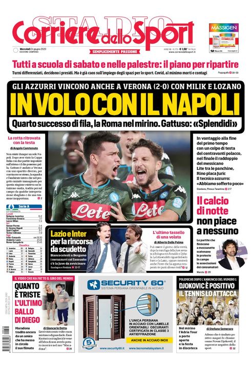 "In volo con il Napoli", così intitola in prima pagina il Corriere dello Sport edizione Campania. Gli azzurri vincono anche a Verona con Milik e Lozano. Quarto successo di fila, la Roma nel mirino. Gattuso: "Splendidi". In vantaggio alla fine del primo tempo con un colpo di testa del centravanti polacco, nel finale il raddoppio del messicano. Lite tra le panchine, Rino placa Juric. Il tecnico azzurro: "Abbiamo sofferto poco"