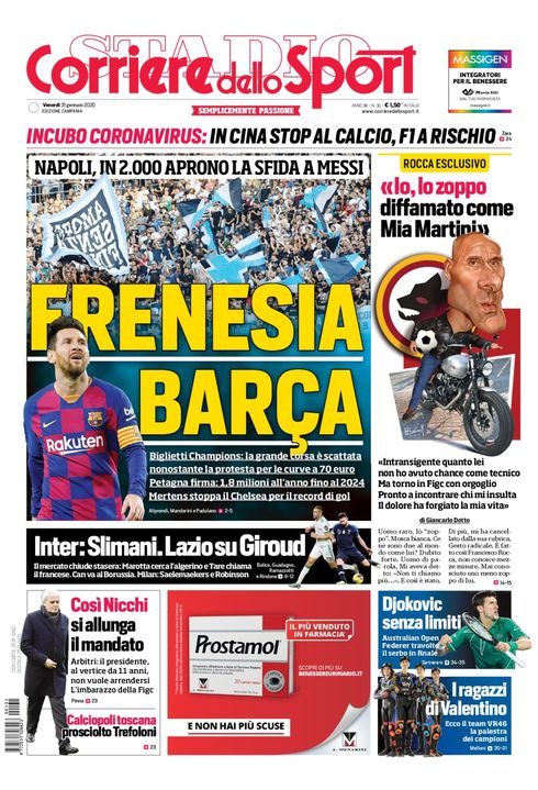 L'edizione di oggi de Il Corriere dello Sport nella sua edizione Campania apre in prima pagina con il Napoli e la "frenesia Barça", in vista del doppio impegno degli azzurri in Champions League contro la squadra catalana. Spazio, poi, al mercato con l'arrivo di Petagna in azzurro e lo stop di Mertens al Chelsea.