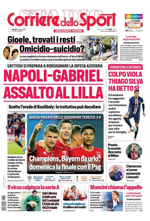 L'edizione di oggi de Il Corriere dello Sport, nella sua edizione Campania, apre in prima pagina con il Napoli e la trattativa per portare Gabriel in azzurro: l'uscita di Koulibaly - si legge - sembra ormai imminente (direzione Manchester City), e cosi il club di De Laurentiis sarebbe pronto all'assalto per il difensore brasiliano indicato proprio come l'erede del senegalese.