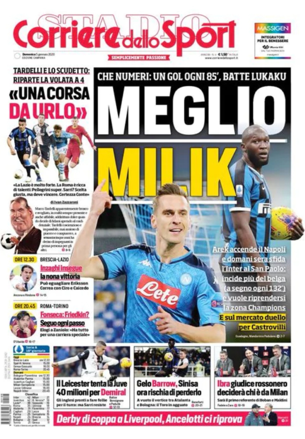 "Napoli-Inter, duello sul mercato per Castrovilli" si legge in prima pagina sull'edizione odierna del Corriere dello Sport. Piace a entrambi i club il talento della Fiorentina. In vista della sfida di domani spazio ai numeri. Le statistiche premiano Milik nel personale duello con Lukaku grazie ad un gol ogni 85 minuti