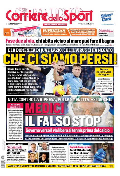 "Napoli-Kean, si può! E' la carta per Allan e Lozano da Ancelotti" si legge in prima pagina sull'edizione campana del quotidiano Corriere dello Sport. L'attaccante di scuola Juventus può diventare pedina di scambio per i due calciatori che Ancelotti vorrebbe ritrovare in Inghilterra. In basso la notizia della Bundesliga pronta a tornare in campo senza mascherina, in alto il ricordo di una data: oggi sarebbe stato il giorno di Juve-Lazio, match scudetto. In alto ultime dal governo: ok per i bagni a chi abita vicino al mare.