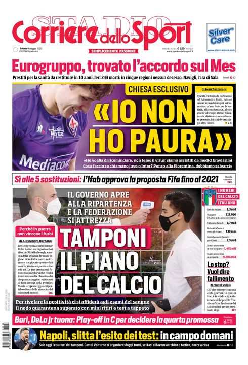 "Napoli, slitta l'esito dei test: in campo domani" si legge in prima pagina sull'edizione campana del Corriere dello Sport. A breve i risultati dei secondi tamponi, poi tutti a Castel Volturno. Ci saranno doppio turni, sei fasi di lavoro aerobico e tattico, quindi docce a casa."Io non ho paura" non è solo il titolo di un film ma anche le parole di Federico Chiesa, attaccante della Fiorentina. "Ho voglia di ricominciare, non temo il virus: siamo assistiti da medici bravissimi" ha detto Chiesa. In primo piano anche il piano del calcio per ricominciare, in basso la notizia dell'ok alla rivoluzione con le 5 sostituzioni per partita.