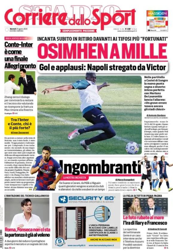 L'edizione di oggi de Il Corriere dello Sport, nella sua versione Campania, apre in prima pagina dando spazio al Napoli ed in particolare a Victor Osimhen, già protagonista dopo la prima giornata di ritiro a Castel di Sangro: "Gol e applausi, Napoli stregato da Victor", scrive in prima pagina il Cds. Spazio, poi, alla situazione in casa Inter con Allegri pronto a prendere il posto di Conte.