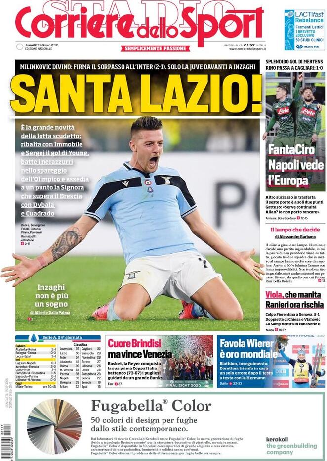 La prima pagina de il Corriere dello Sport titola: "Santa Lazio", è la grande novità della lotta Scudetto: ribalta con Immobile e Sergej il gol di Young, batte i nerazzurri nello spareggio dell'Olimpico e assedia a un punto la Signora che supera il Brescia con Dybala e Cuadrado. Di fianco spazio alla vittoria degli azzurri contro il Cagliari: "FantaCiro, Napoli vede l'Europa", splendido gol di Mertens, Rino passa a Cagliari: altro successo in trasferta, il sesto posto è a soli due punti. Gattuso: "Serve continuità, Allan? Io non porto rancore"