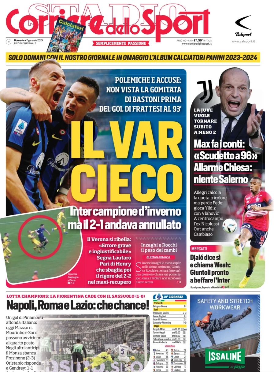 "Il VAR cieco", titola il Corriere dello Sport per raccontare della vittoria dell'Inter tra polemiche ed accuse: non vista la gomitata di Bastoni prima del gol di Frattesi al 93'. Inter campione d'inverno ma il 2-1 andava annullato. "Napoli, Roma, Lazio: che chance", il titolo in taglio basso dopo il ko della Fiorentina. Di seguito la prima pagina integrale
