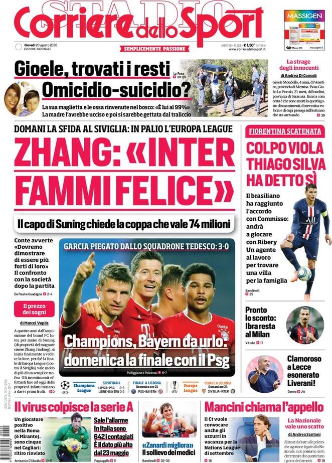 L'edizione di oggi de Il Corriere dello Sport apre in prima pagina dando spazio all'Inter e le parole del suo presidente in vista della finale di Europa League di domani contro il Siviglia. Spazio poi ai contagi di Coronavirus in Serie A con Cagliari e Roma colpite nelle ultime ore, poi la Fiorentina ed il possibile acquisto di Thiago Silva.