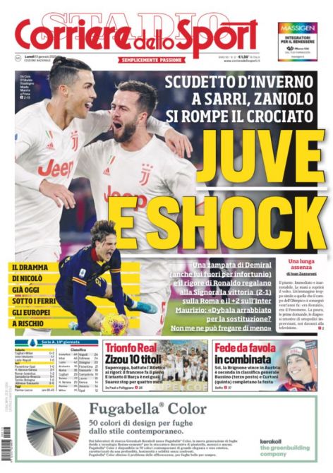 "Juve e shock" si legge in prima pagina sull'edizione odierna del Corriere dello Sport. Si parla della vittoria dei bianconeri sulla Roma ma anche del brutto infortunio a Zaniolo: per lui rottura del crociato, oggi l'operazione, a rischio gli Europei. La Juve, intanto, vince all'Olimpico, stacca l'Inter e diventa campione d'inverno. In basso: Trionfo Real, Zizou 10 titoli. Per i blancos vittoria in finale di Supercoppa contro l'Atletico Madrid ai calci di rigore. Poi "Fede da favola in combinata" per cambiare sport.