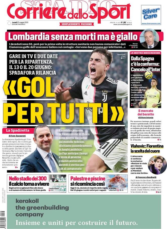 La prima pagina de il Corriere dello Sport apre con la proposta del Ministro Spadafora di far vedere le partite in chiaro: "Gol per tutti", il Ministro propone la trasmissione in chiaro della diretta dai campi sul modello tedesco: "Evitiamo assembramenti in luoghi pubblici", la FIGC anticipa i tempi e invia al Governo il nuovo protocollo: giovedì il vertice per l'ok al campionato