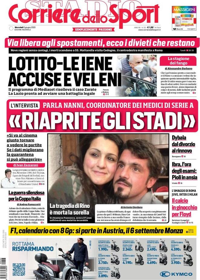 L'edizione di oggi de Il Corriere dello Sport apre in prima pagina dando spazio alla tragedia che ha colpito l'allenatore del Napoli Rino Gattuso, con la scomparsa della sorella Francesca di 37 anni avvenuta nella giornata di ieri, "vittima di una malattia incurabile". Spazio, poi, alla polemica tra Lotito e Le Iene e l'apertura delle regioni.