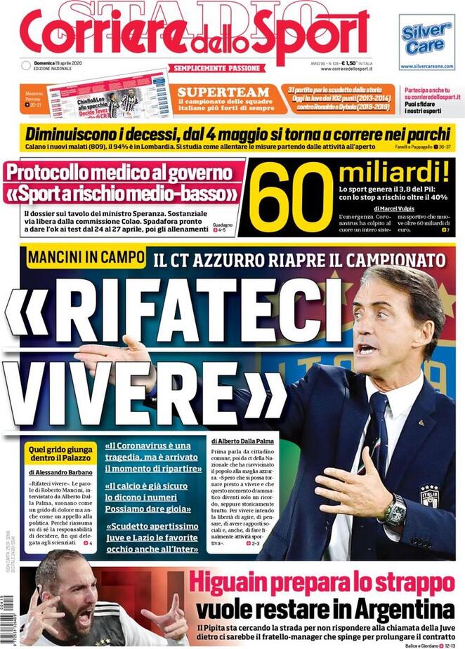 "Rifateci vivere", apre con le parole del Ct della Nazionale Roberto Mancini la prima pagina de il Corriere dello Sport. Il tecnico azzurro riapre il campionato. In taglio alto spazio al protocollo medico al Governo: "Sport a rischio medio-basso".