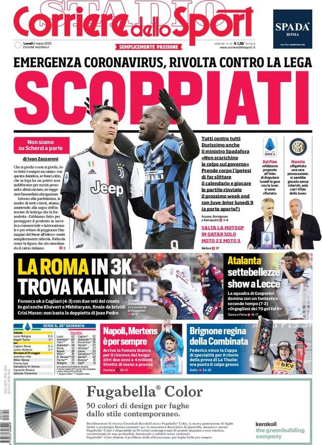 "Scoppiati" si legge in prima pagina sull'edizione odierna del Corriere dello Sport. Focus e polemiche sulla Serie A e il rinvio delle partite. In basso: "Napoli, Mertens è per sempre". Arriva la fumata bianca per il rinnovo del belga: altri due anni a 4 milioni. Stretta di mano a pranzo, scrive il quotidiano. Sul campionato: La Roma trova Kalinic, Atalanta show a Lecce.