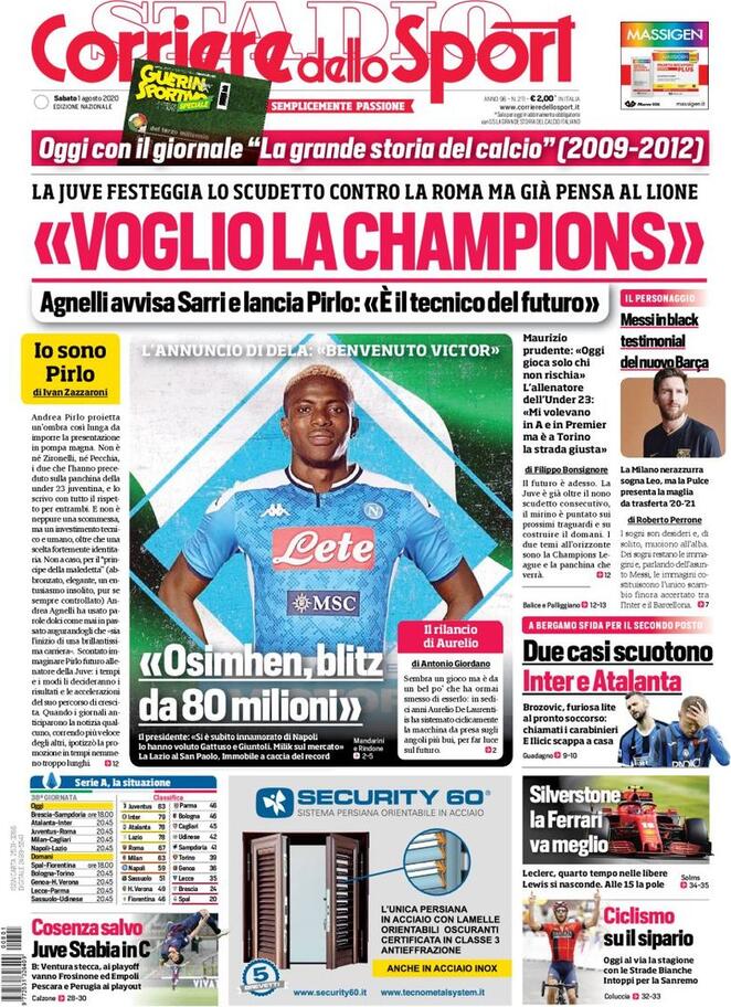 La prima pagina de il Corriere dello Sport apre con l'ufficialità del Napoli dell'acquisto di Victor Osimhen: "Osimhen, blitz da 80 milioni". Il Presidente Aurelio De Laurentiis: "Si è subito innamorato di Napoli. Lo hanno voluto Gattuso e Giuntoli. Milik sul mercato". La Lazio al San Paolo. Immobile a caccia del record.