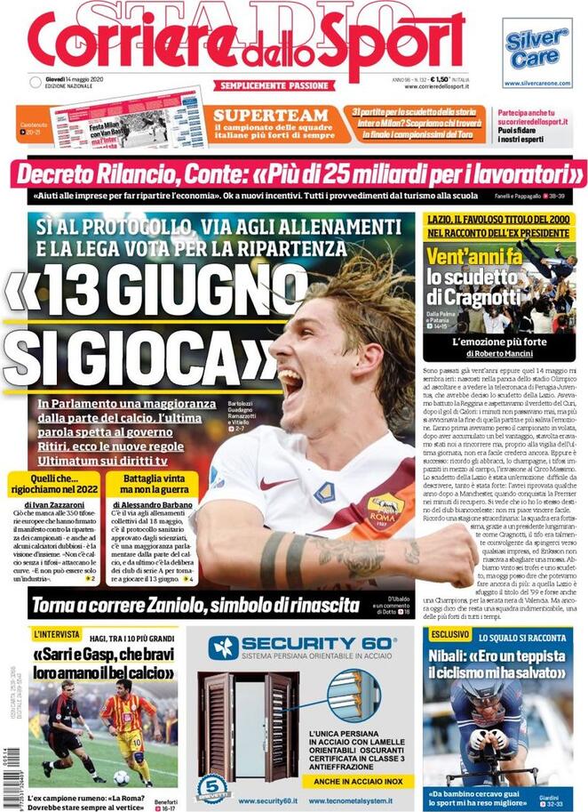 PRIMA PAGINA - CdS: "Si al protocollo, via agli allenamenti. Il 13 giugno si gioca"