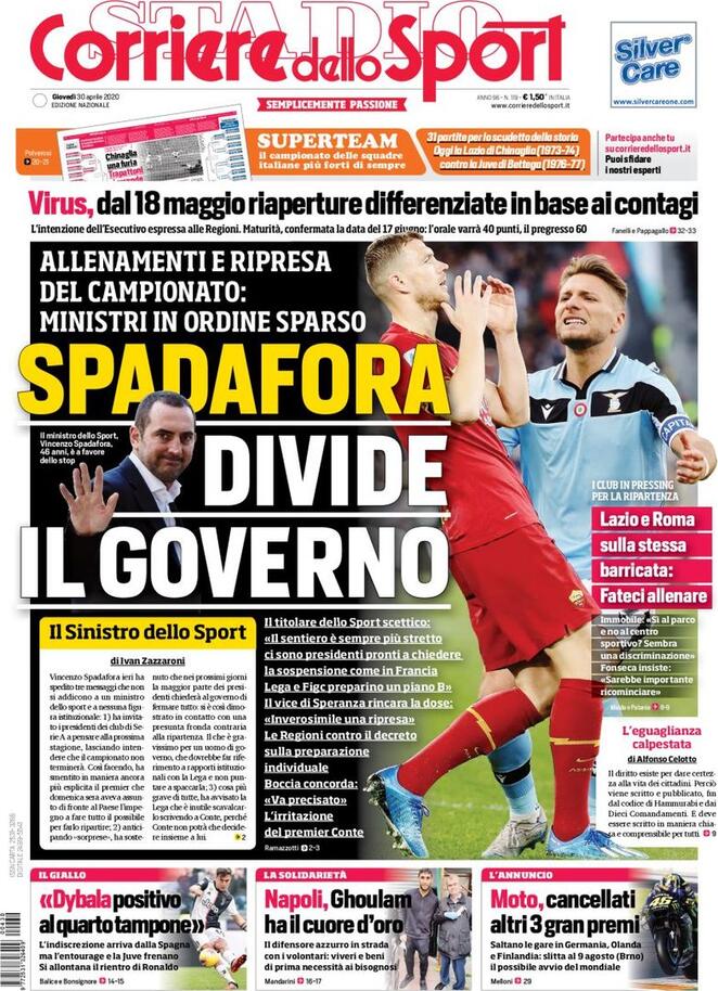 L'edizione di oggi de Il Corriere dello Sport apre in prima pagina con l'emergenza Coronavirus e la ripartenza del calcio, con il ministro dello Sport Spadafora che di fatto divide il calcio italiano. Spazio anche al Napoli, con il cuore d'oro Ghoulam in strada insieme ai volontari per distribuire viveri e beni di prima necessità ai bisognosi.