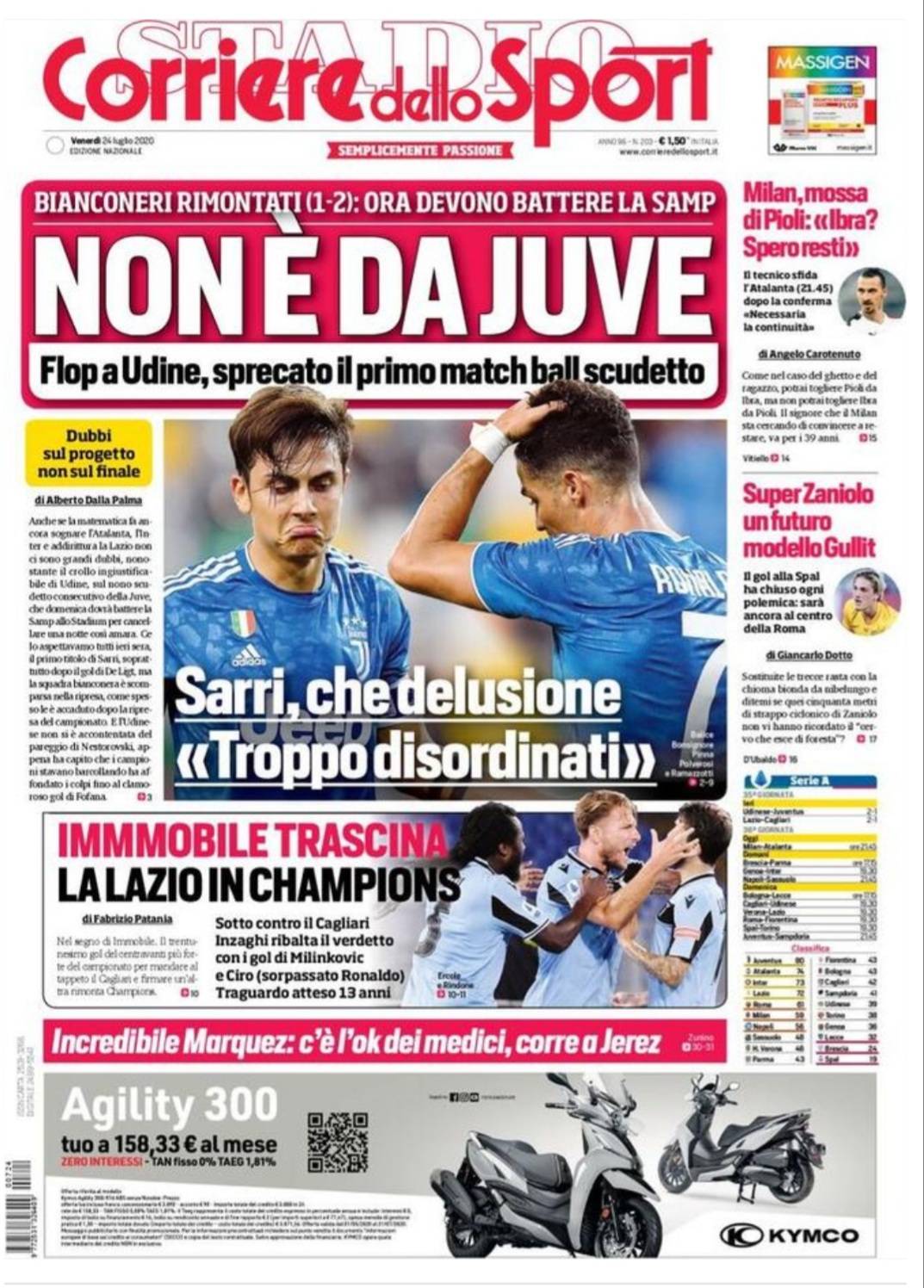 "Non era Juve". È questo il titolo in primo piano sul Corriere dello Sport, ovviamente in riferimento al k.o. della Juventus in casa contro l'Udinese. "Immobile trascina la Lazio in Champions", titola il quotidiano su Lazio-Cagliari.