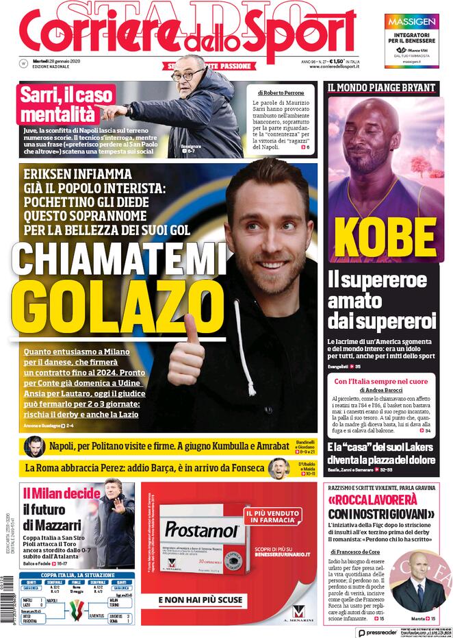 Il Corriere dello Sport dedica un piccolo spazio anche al Napoli e al suo mercato in prima pagina. "Per Politano visite e firme. A giugno Kumbulla e Amrabat", si legge sul quotidiano che in primo piano invece celebra il colpo dell'Inter Eriksen: "Chiamatemi golazo".