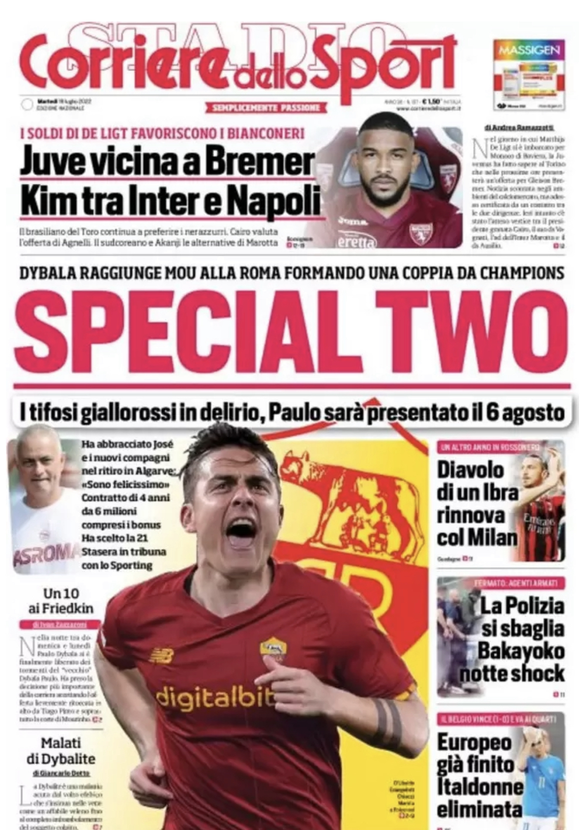 Il Corriere dello Sport apre in prima pagina con il mercato di Inter e Juve che si intreccia con quello del Napoli: “Juve vicina a Bremer, Kim tra Inter e Napoli. I soldi di de Ligt favoriscono i bianconeri. Il brasiliano del Toro continua a preferire i nerazzurri. Cairo valuta l’offerta di Agnelli. Il sudcoreano e Akanji le alternative di Marotta”. In taglio centrale il colpo della Roma che si aggiudica Dybala: “Special Two. Dybala raggiunge Mou alla Roma formando una coppia da Champions”. Di spalla il Milan e il rinnovo di Ibrahimovic e l’Europeo femminile finito nel peggiore dei modi per l’Italia.