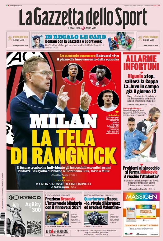 Allarme infortuni. Taglio laterale della prima pagina della Gazzetta dello Sport dedicato ai già numerosi infortuni che hanno colpito le squadre di Serie A. L'ultimo, in ordine di tempo, è stato il Pipita Higuain, fermato da un problema muscolare che lo terrà fuori per la semifinale di Coppa Italia. Poi sempre nella giornata di ieri si è fermato Sergej Milinkovic-Savic: per lui una distorsione al ginocchio che non ha però toccato i legamenti. E' a rischio la sua presenza nel primo match, contro l'Atalanta.