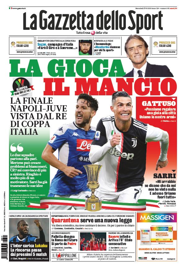 "La gioca il Mancio" scrive La Gazzetta dello Sport in apertura quest'oggi. La finale di Coppa Italia tra Napoli e Juventus in programma questa sera allo stadio Olimpico di Roma, giocata in anteprima dal commissario tecnico della Nazionale, Roberto Mancini. La finale vista dal re di Coppa Italia (6 trofei da calciatore, 4 da allenatore): "Le due squadre partono alla pari. Mertens può creare problemi ai bianconeri. CR7 mi convince di più a sinistra. Ringhio è molto più di un motivatore. Sarri ha già trasmesso le sue idee". Ieri hanno parlato anche i due allenatori. Gattuso: "Possiamo regalare una gioia alla città". Sarri: "Mi arrabbio se dicono che in Italia non ho vinto niente".