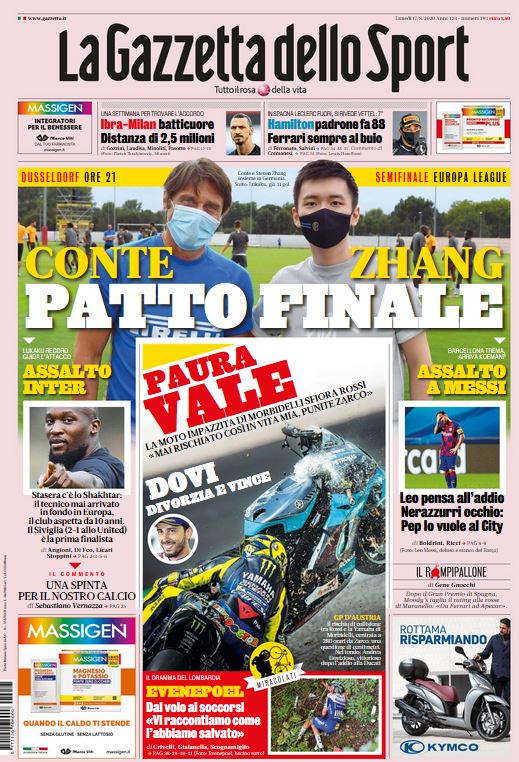 La Gazzetta dello Sport oggi in edicola apre con il titolo: "Conte-Zhang, patto finale". L'allenatore ed il presidente nerazzurro sono a Dusseldorf, dove stasera alle 21 l'Inter sfiderà gli ucraini dello Shakhtar Donetsk, alla ricerca della finale di Europa League. Finale che il tecnico non ha mai raggiunto in Europa, mentre il club nerazzurro è assente da una finale europea da dieci anni, quindi dall'anno del Triplete. Chi vincerà questa sera troverà ad attenderlo il Siviglia, che ieri sera ha superato per 2 a 1 il Manchester United.