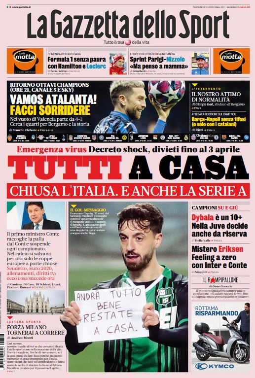 "Barcellona-Napoli senza tifosi (e solo con i catalani)" si legge in prima pagina su La Gazzetta dello Sport oggi in edicola. Attesa a ore la decisione del governo spagnolo sulla gara di mercoledì prossimo. In primo piano si legge "Tutti a casa" col nuovo decreto del governo per fermare l'emergenza del coronavirus. Di spalla elogi a Dybala e sull'Inter: "Mistero Wriksen, feeling a zero con Conte".