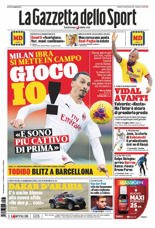 "Gioco io. E sono più cattivo di prima": così La Gazzetta dello Sport in apertura su Zlatan Ibrahimovic, che ieri è stato presentato a stampa e tifosi. Il nuovo attaccante del Milan si rimette in gioco. Ieri già in campo nella formazione titolare nel test amichevole disputato dalla formazione di Pioli. Zlatan vuole essere titolare lunedì contro la Samp: "Non sono qui per fare la mascotte. Non ho più 28 anni, correrò meno ma posso tirare da 40 metri". Intanto rossoneri scatenati sul mercato: blitz a Barcellona per il difensore Todibo.