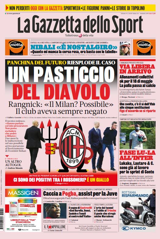 "Un pasticcio del diavolo", è il titolo d'apertura de La Gazzetta dello Sport oggi in edicola. Riesplode il caso in casa Milan sulla panchina del futuro, con il tanto chiacchierato Rangnick che dichiara: "Panchina del Milan? Possibile. Hanno parlato con il mio procuratore, non posso escludere che andrò al Milan". Fino a ieri il club però aveva sempre negato i contatti con il tecnico tedesco: due mesi fa le prime indiscrezioni avevano portato al licenziamento di Zvonimir Boban. Nel frattempo in casa rossonera resta anche il nodo legato ad alcuni tamponi che sarebbero risultati positivi al Covid-19.