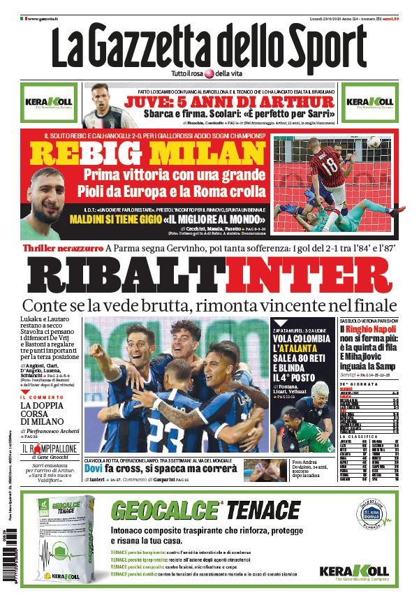 "RibaltInter" scrive La Gazzetta dello Sport in apertura quest'oggi. Spazio alla vittoria della formazione di Antonio Conte al Tardi contro il Parma. Sotto di un gol (Gervinho), i nerazzurri la ribaltano nel finale. Prima l'1-1 di De Vrij, poi l'1-2 finale dell'ex Bastoni. Conte se la vede male. Lukaku e Lautaro restano a secco ma ci pensano i difensori a regalare 3 punti importanti per il terzo posto.