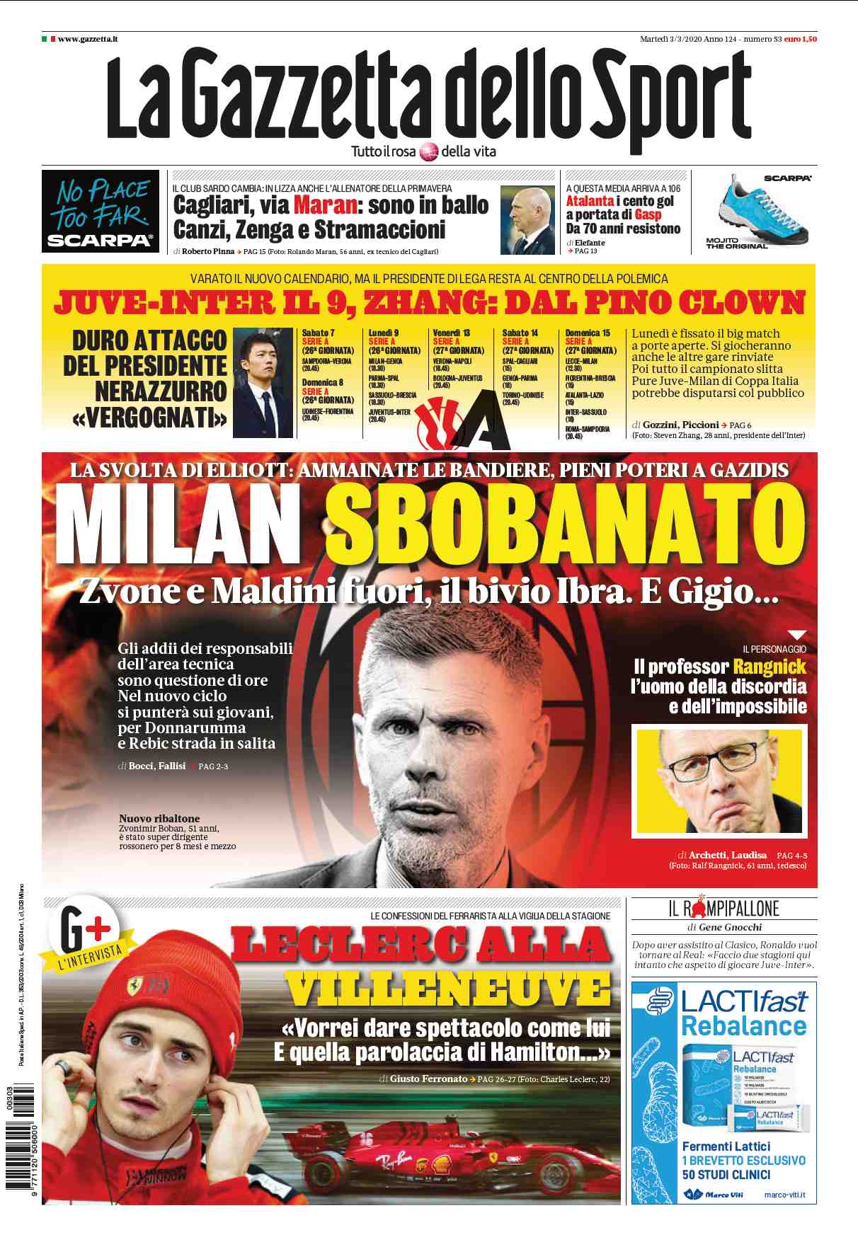 "Duro attacco di Zhang alla Lega. Milan sbobanato" questi alcuni dei principali titoli in prima pagina su La Gazzetta dello Sport oggi in edicola. Si passa dalle polemiche per il rinvio delle partite alle difficoltà societarie nel Milan col possibile addio dell'ex attaccante croato. In alto l'addio di Maran e tre nomi per la sostituzione: si tratta di Zenga, Stramaccioni e Canzi.