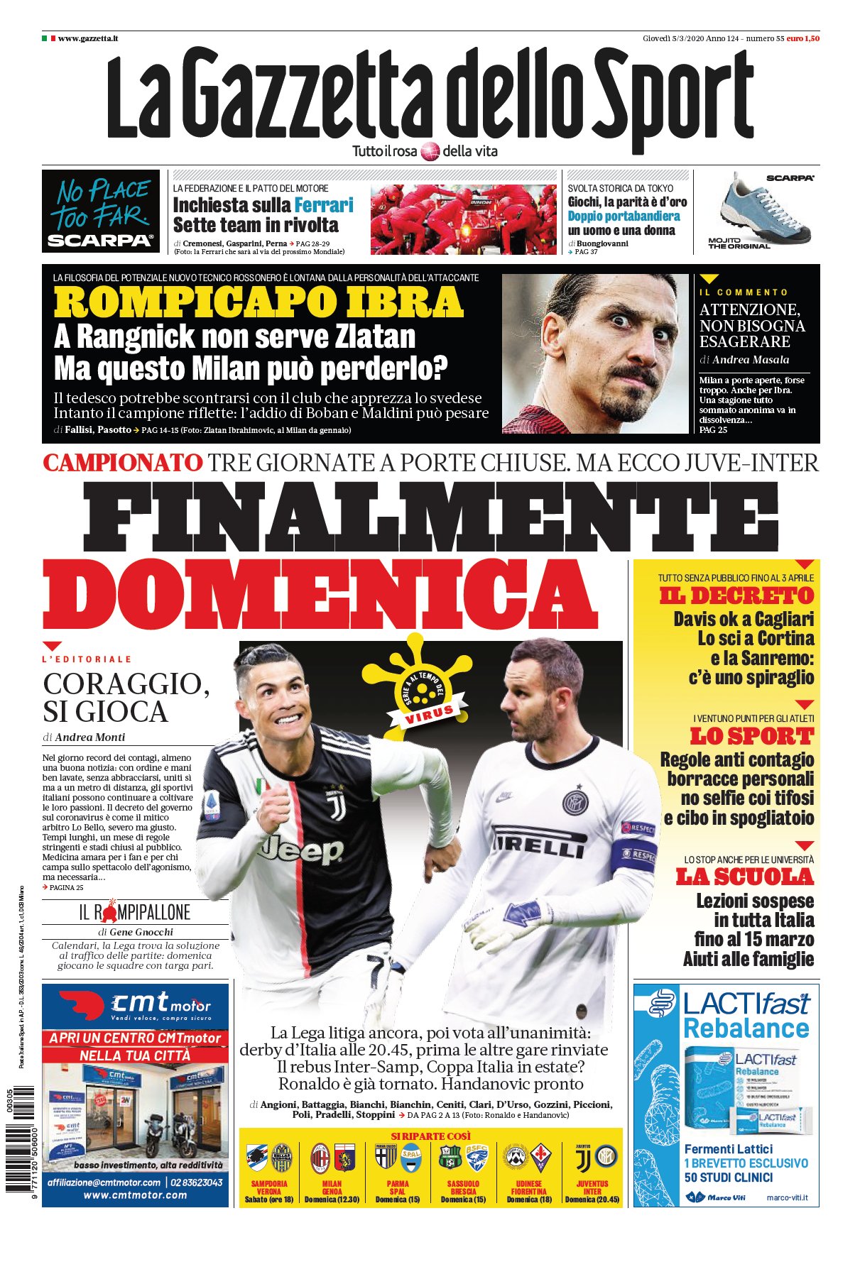 "Finalmente domenica! Tre turni a porte chiuse" si legge in prima pagina sull'edizione odierna de La Gazzetta dello Sport. In attesa del comunicato ufficiale della Lega, pronto il calendario per il prossimo weekend. Si torna così in campo e si è finalmente trovato un punto d'incontro. In alto si parla di Milan, di problemi societari e di quello che potrebbe essere il futuro di Ibrahimovic. Di spalla tutti i provvedimenti del governo per il coronavirus come le scuole chiuse fino al prossimo 15 marzo.
