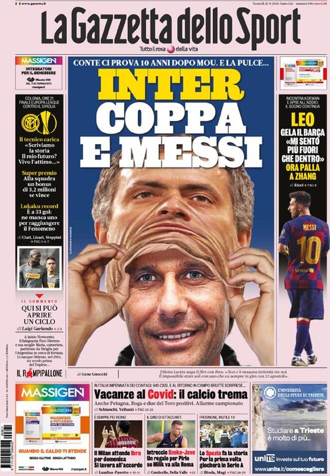 "Inter, coppa e Messi". Questa l'apertura che La Gazzetta dello Sport dedica ai nerazzurri, impegnati questa sera a Colonia nella finale di Europa League contro il Siviglia. Conte ci prova dieci anni dopo Mou e glissa sul futuro: "Vivo l'attimo". Bonus di 3,2 milioni alla squadra se vince, mentre Lukaku insegue il record di Ronaldo. Intanto Messi gela il Barça: "Mi sento più fuori che dentro". Ora la palla passa a Zhang.