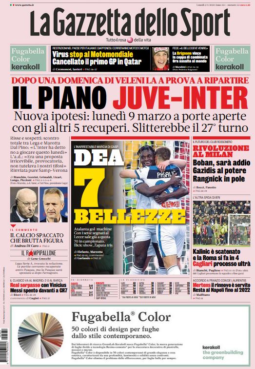 Si parla anche del caos calendari. La Serie A dopo una domenica di veleni, con attacchi da tutte le parti verso la Lega e le sue decisioni, prova a ripartire. E lo fa con una nuova ipotesi circolata ieri sera: le sei partite rinviate in questo weekend potrebbero essere recuperate tra sabato, domenica e lunedì, con il ventisettesimo turno pronto a slittare in blocco. Juventus-Inter finirebbe così a lunedì 9 marzo, a porte aperte. Ma è scontro totale tra l'Inter e la Lega Calcio per le modalità con cui è stato deciso il rinvio.